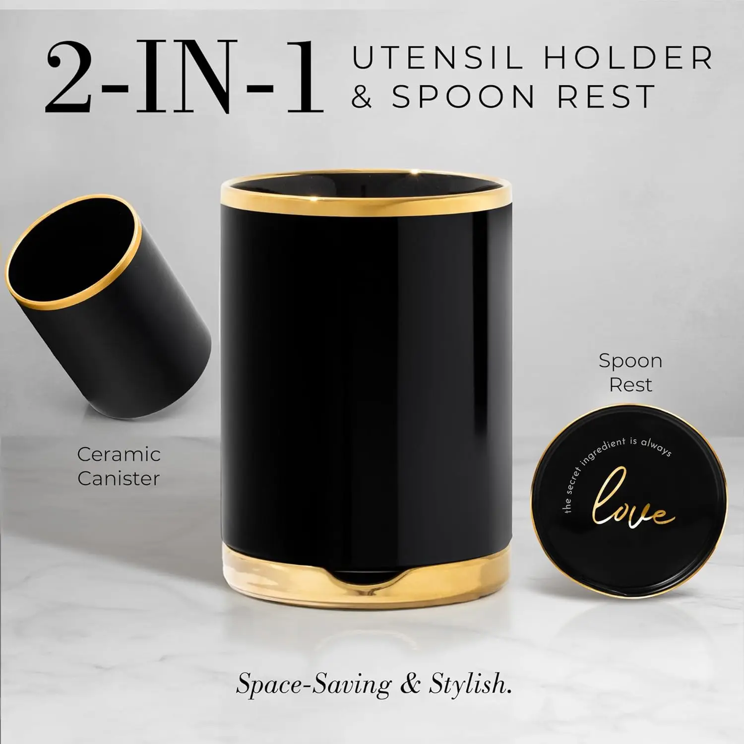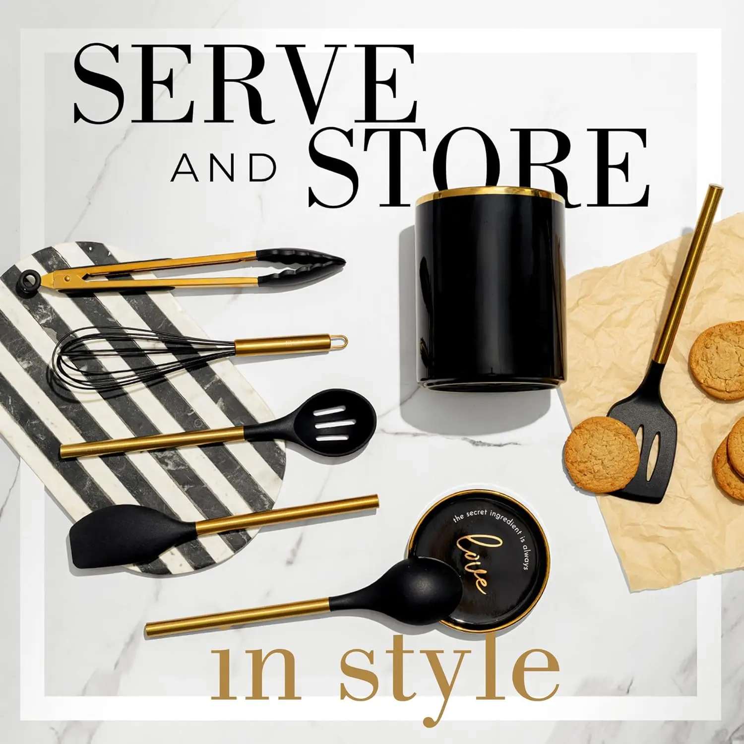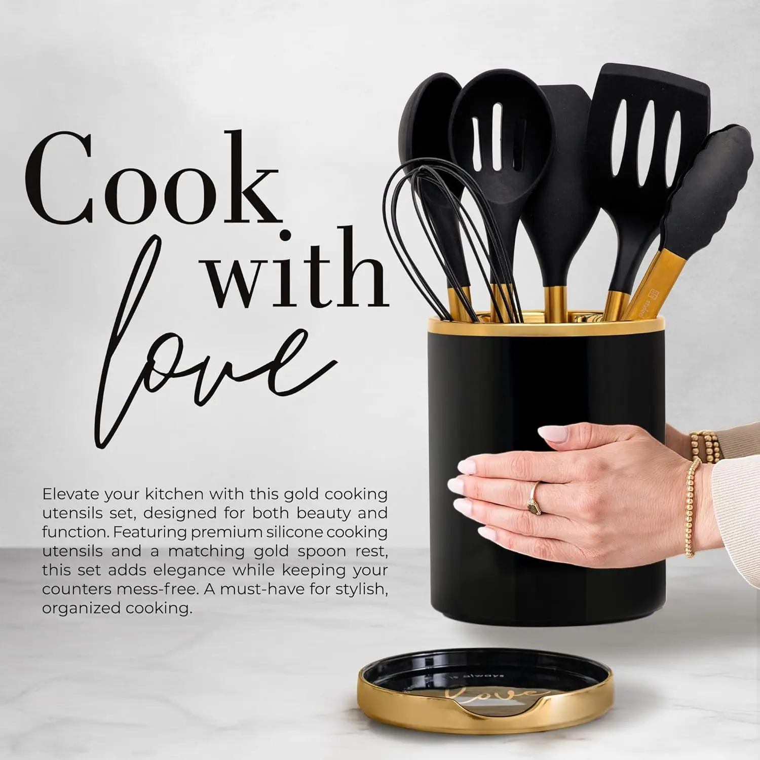 Elevate your kitchen style with this elegant black gold utensils set designed for both functionality and modern aesthetics. This 8-piece set includes essential cooking tools along with a convenient holder and spoon rest for organized and efficient use. Made from high-quality silicone, each utensil is safe for nonstick cookware, preventing scratches and damage. The heat-resistant design ensures reliable performance even during high-temperature cooking. Featuring sleek black silicone heads paired with gold-accented handles, this set adds a luxurious touch to any kitchen décor. The ergonomic handles provide a comfortable and secure grip for better control while cooking. Perfect for stirring, flipping, serving, and more, these tools cover all your everyday cooking needs. The included holder keeps your utensils neatly stored and easily accessible. The spoon rest helps maintain a clean and tidy cooking space by catching drips and spills. Durable and easy to clean, this set is designed for long-lasting use. Ideal for both beginner cooks and experienced chefs, it enhances convenience and efficiency in the kitchen. The stylish design makes it a great addition to modern kitchens or a thoughtful gift for housewarmings. Lightweight yet sturdy, the utensils are easy to handleÂ
